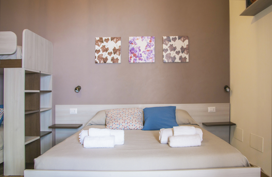 Wine Room is the room designed for wine lovers. The warm tones that recall the rows of vines in their most beautiful colors, make this space a place with a magical atmosphere. A thematic bookshop on the world of quality wine awaits you in your room. Wine Room is a bright room thanks to direct access to the terrace, a shared space where you can stop for breakfast or to rest after a day of exploration. The spacious room can accommodate up to four beds with the possibility of adding a baby bed on request.